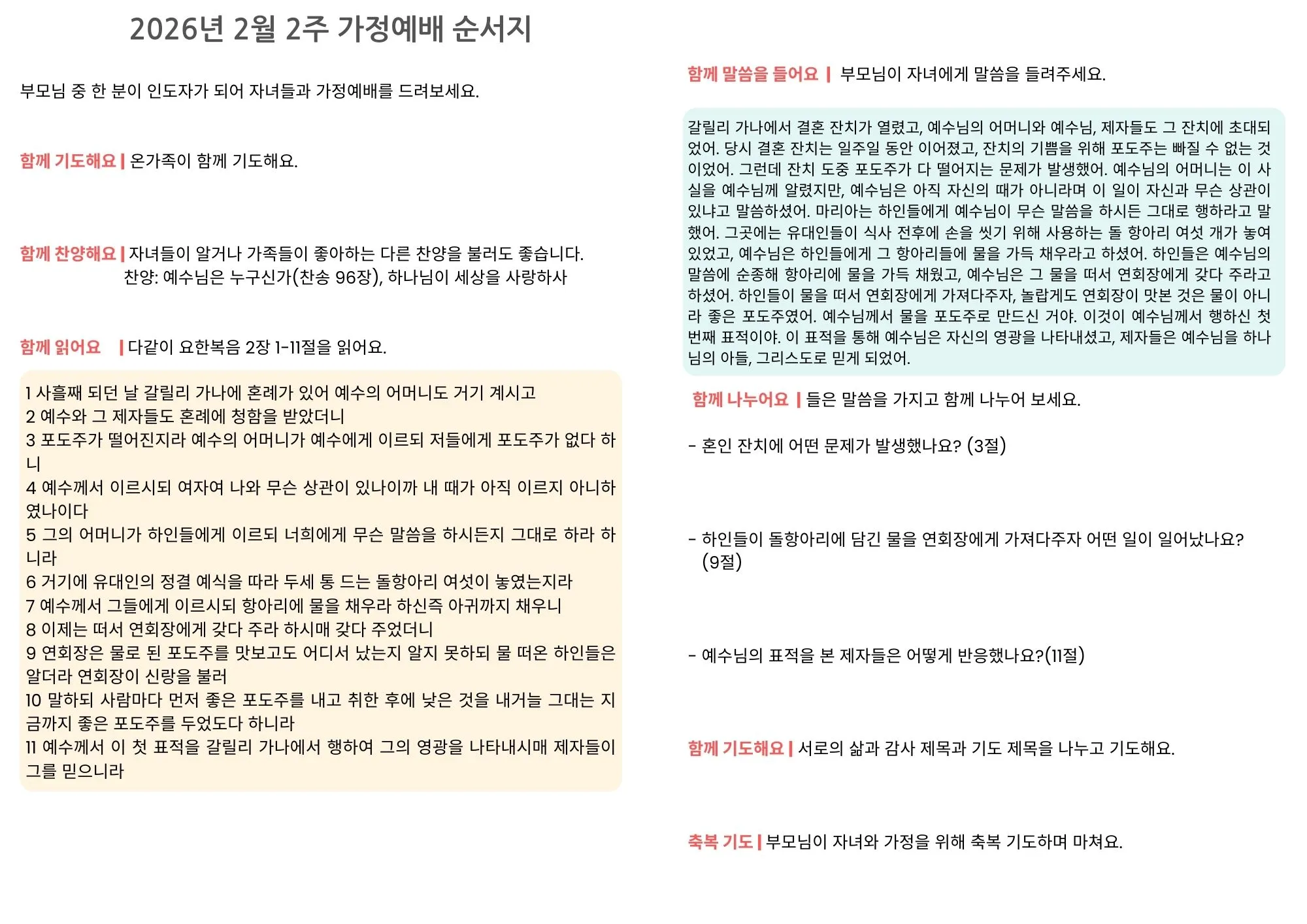 [가정예배순서지] 2026년 2월 2주 가정예배