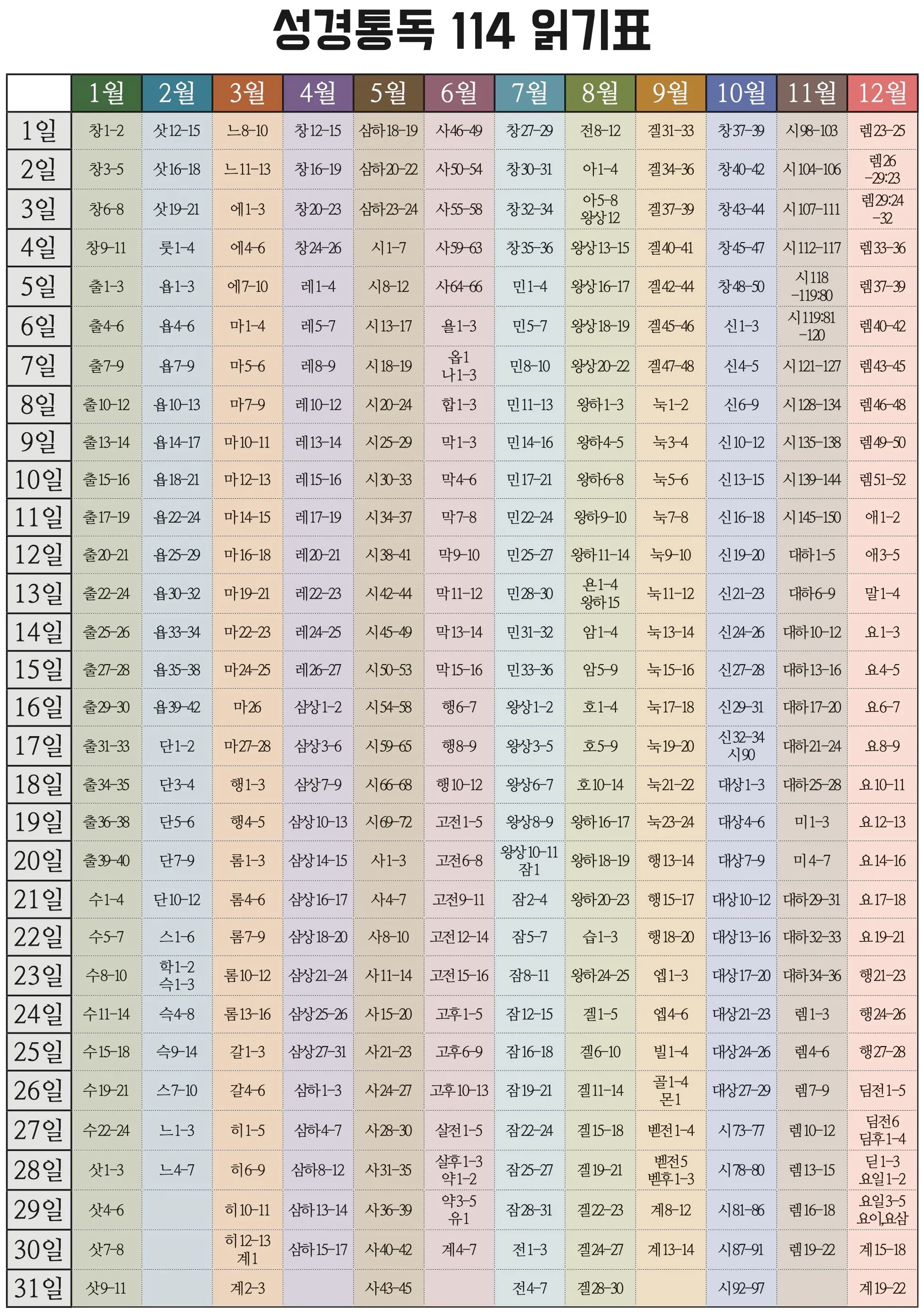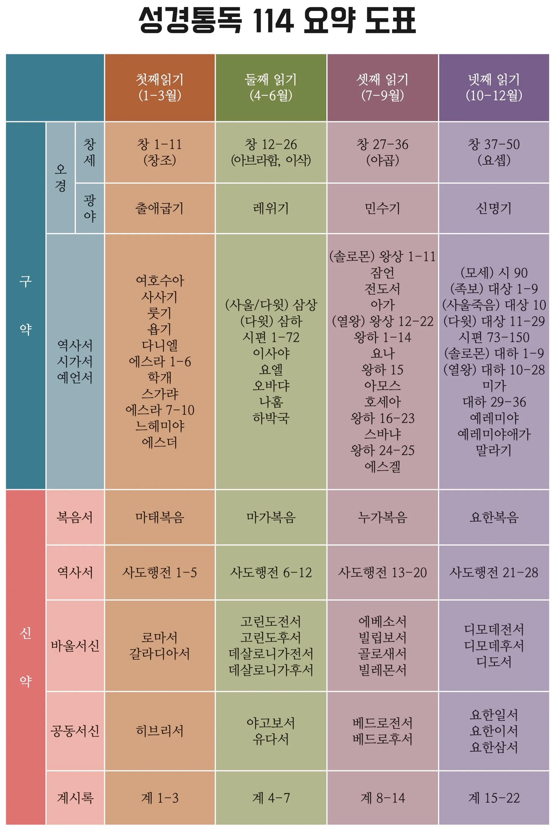 나는 이런 전제 아래 구약성경과 신약성경을 사분기로 읽을 수 있도록 도표로 나누어보았다. 나는 이것에 편의상 “성경통독 114”라는 이름을 붙였다. 그 뜻은 성경통독 114(1ㆍ1ㆍ4)는 성경전체를 1년에 1번 통독하지만(1년 1독) 4번 읽는 효과를 낸다는 것이다. 달리 말하자면, 3개월마다 성경을 한 번씩 읽는 것과 같다. 성경통독 114는 성경을 읽는 사람들에게 최소한 두 가지 유익을 준다.