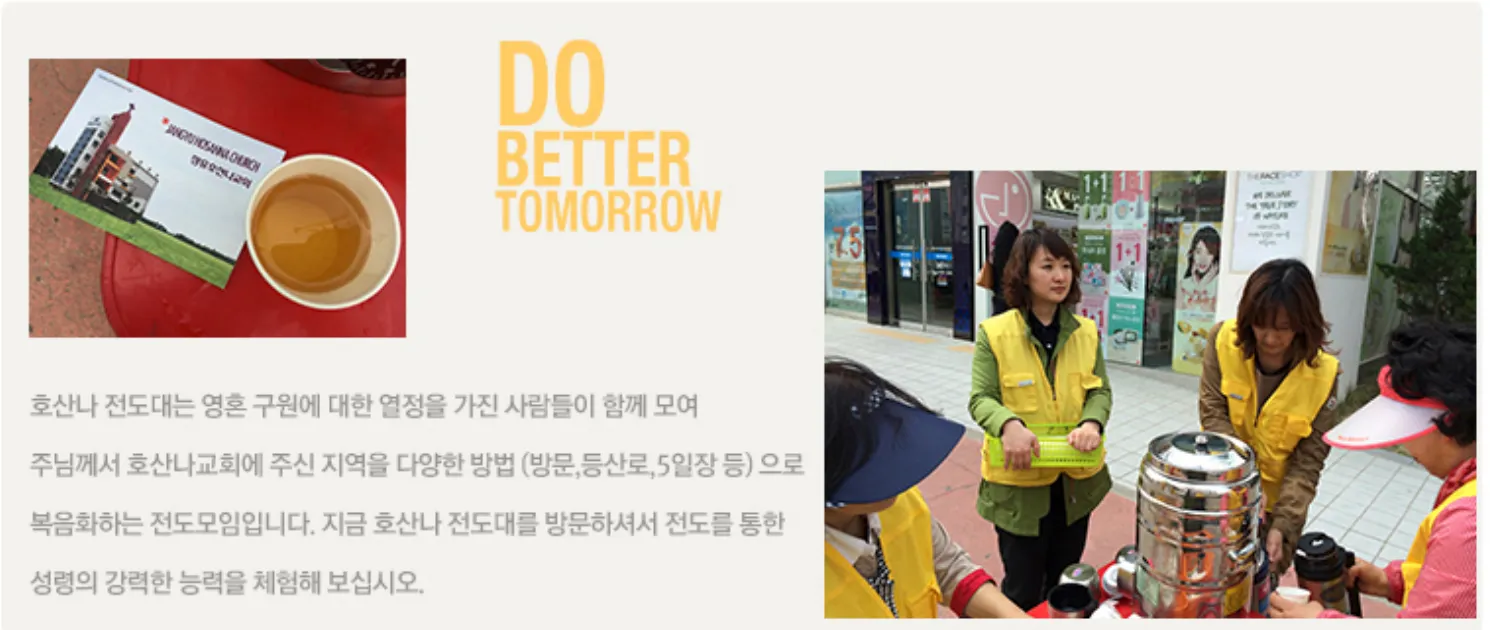 호산나 전도대는 영혼 구원에 대한 열정을 가진 사람들이 함께 모여 다양한 방법(방문, 등산로, 5일장 등)으로 복음을 전하는 모임입니다. 지금 호산나 전도대를 방문하셔서 전도를 통한 성령의 강력한 능력을 체험해 보십시오.