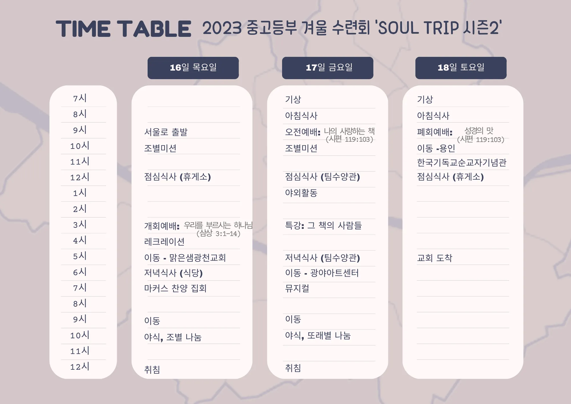 아래 시간표와 주요 프로그램 안내를 참고하셔서 2박 3일동안 은혜의 시간 될 수 있도록 기도 부탁드립니다^^